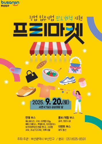 [뉴스스텝] 부산진구는 9월 20일 서면 KT&G 상상마당 앞에서 13시부터 18시까지 ‘2025 창업 입주기업 판로개척 지원 프리마켓’을 개최한다고 밝혔다.