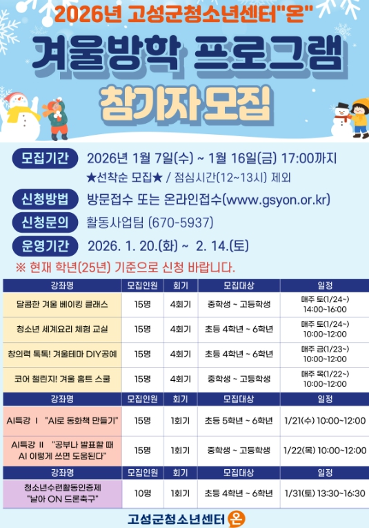 [뉴스스텝] 고성군청소년센터“온”은 겨울방학을 맞이한 관내 청소년들을 대상으로 2026년 1월 20일부터 2월 14일까지 2026년 겨울방학 프로그램 및 특강을 운영한다.