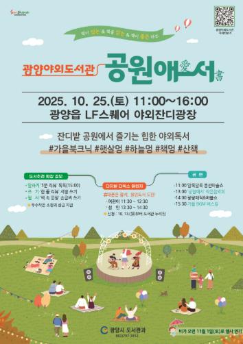 [뉴스스텝] 광양시는 오는 10월 25일 광양읍 LF스퀘어 잔디밭공원에서 자연과 책이 어우러진 『광양 야외도서관–공원애愛서書』 행사를 연다고 밝혔다.