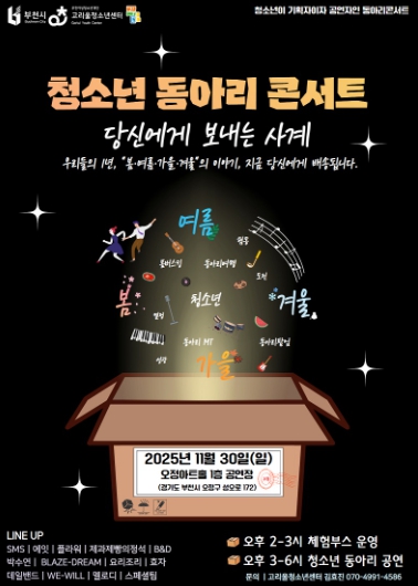 [뉴스스텝] 부천여성청소년재단이 운영하는 고리울청소년센터는 2025년 11월 30일, 부천시 고강동 소재 오정아트홀 1층 공연장에서 지역 청소년들이 직접 기획하고 무대에 오르는 특별한 공연, ‘청소년 동아리 콘서트 – 당신에게 보내는 사계’가 열린다.