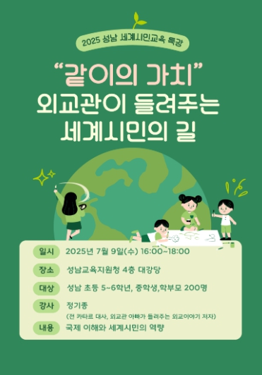 한양수 교육장은 “이번 특강은 성남의 학생들이 세계의 다양한 관점과 문화를 이해하고, 함께 살아가는 지혜를 키울 수 있는 뜻깊은 시간이었다”며 “앞으로도 국제적 감각과 포용적 사고를 지닌 미래인재 양성을 위해 세계시민교육을 지속적으로 강화하겠다”고 말했다.