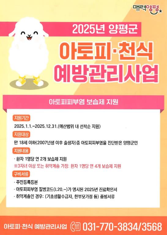 ‘아토피 피부염 보습제 지원 사업’은 소득 기준과 관계없이 아토피 피부염 환아에게 보습제를 지원하는 사업으로, 신청 대상은 양평군에 거주하는 만 18세 이하(2007년 이후 출생) 아토피 피부염 환자이다. 일반 가정은 환자 1명당 연 2개, 다자녀 가정 및 취약계층 가정은 환자 1명당 연 4개의 보습제가 지원된다. 신청 시 주민등록등본과 해당 연도 아토피 질병 코드가 기재된 병원 발급 서류 등 기타 증빙서류를 제출해야 한다.