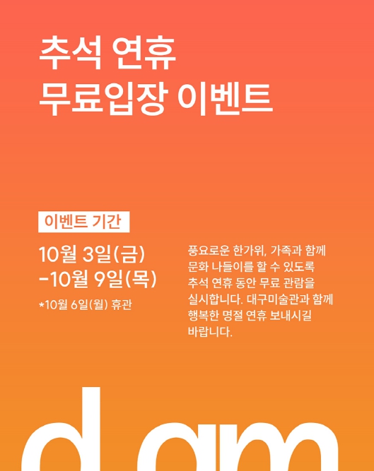 [뉴스스텝] 대구문화예술진흥원대구미술관은 추석 당일인 10월 6일 휴관하고, 연휴 기간인 3일부터 9일까지 무료 개관해 시민들의 명절 문화생활을 함께 한다.