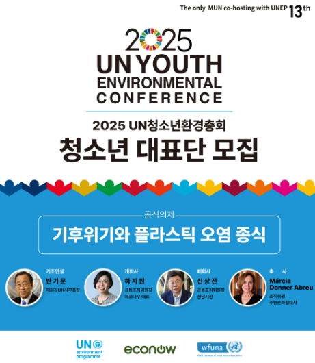 [뉴스스텝] 성남시청소년청년재단 판교유스센터와 환경단체 에코나우는 오는 11월 15일부터 16일까지 이틀간 성남 국립국제교육원에서 열리는 ‘2025 UN청소년환경총회’에 참가할 국내외 청소년 대표단 300명을 10월 13일까지 모집한다. 이번 총회는 성남시청소년청년재단 판교유스센터와 환경단체 에코나우가 공동 주관하며, 반기문 전 UN사무총장과 브라질 대사 등 주요 인사가 참석한다.