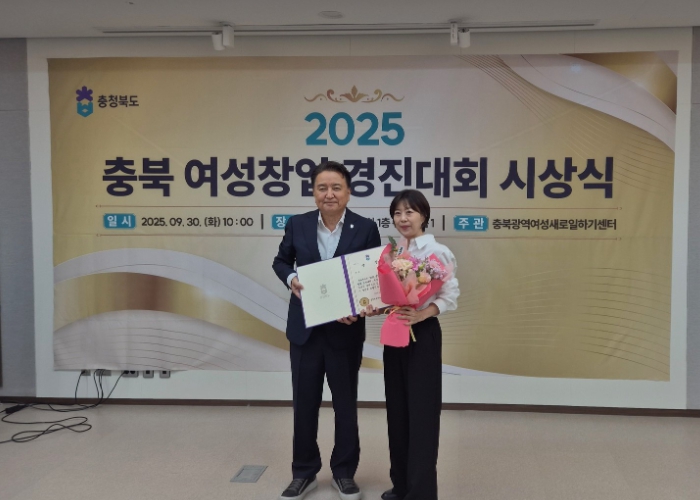 [뉴스스텝] 지난 9월 30일 충청북도의회 워크숍실에서 열린 ‘2025 충북 여성창업 경진대회’에서 제천여성새로일하기센터 지연옥씨(바닐라유닛/사용자 프로파일 기반 AI 지역정보 추천 플랫폼 ‘오늘의 제천’)가 우수상을 받았다.