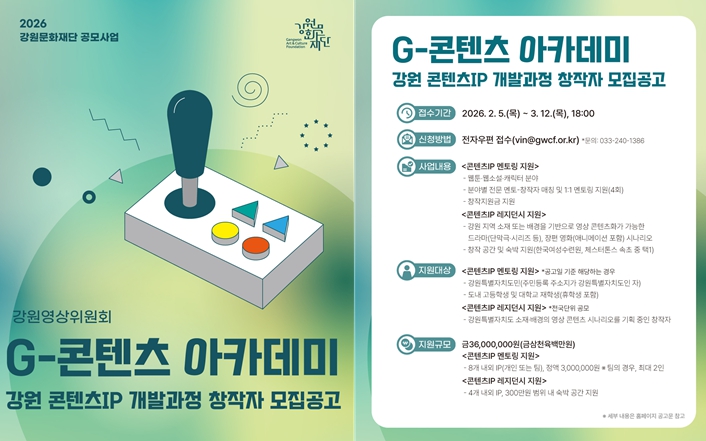 | ▲ 강원문화재단, 2026년 G-콘텐츠 아카데미 '강원 콘텐츠IP 개발과정' 창작자 공개 모집 |