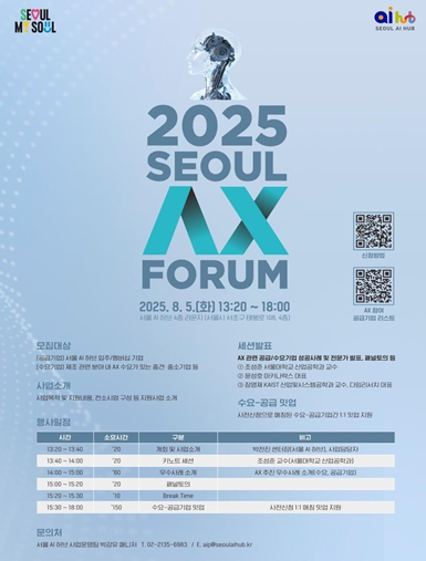 이를 위한 사전설명회인 ‘AX 포럼 2025’는 오는 8월 5일 서울 AI 허브 메인센터에서 개최된다. 이 자리에서는 AI 전환 및 협업 우수사례 발표와 기업 간 밋업 프로그램을 통해 수요·공급 기업 간 협업을 구체화할 예정이다.