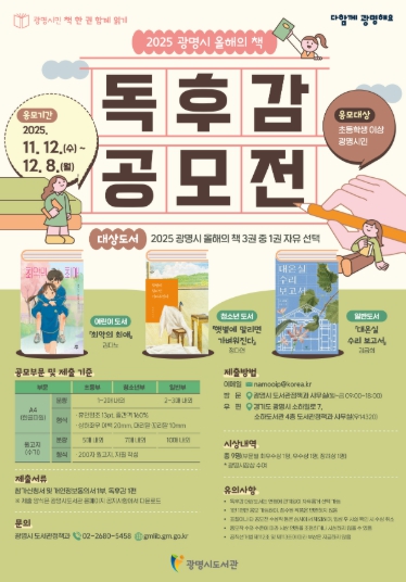 참여자는 2025년 광명시 올해의 책으로 선정된 ▲대온실 수리 보고서(김금희) ▲햇볕에 말리면 가벼워진다(정다연) ▲최악의 최애(김다노) 중 한 권을 선택해 독후감을 작성하면 된다.