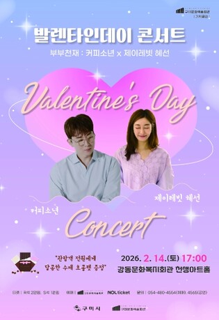 [뉴스스텝] 구미시는 오는 2월 14일 오후 5시, 강동문화복지회관 천생아트홀에서 발렌타인데이 콘서트〈부부천재 : 커피소년 x 제이레빗 혜선〉을 개최한다.이번 공연은 사랑의 노래로 결실을 맺은 부부 싱어송라이터 커피소년과 제이레빗 혜선이 함께 무대에 올라, 일상 속 사랑과 공감을 담은 따뜻한 음악을 선보이는 감성 콘서트로 기획됐다. 담백한 목소리와 진솔한 이야기로 구성된 ‘사랑의 플레이리스트’를 통해 관객
