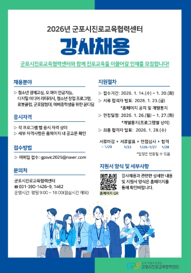 군포시진로교육협력센터 이혜진 센터장은 “이번 강사 공개 모집을 통해 투명하고 공정한 절차에 따라 다양한 분야의 전문 강사를 확보하여, 학생들의 진로 이해와 자기 탐색을 돕는 질 높은 진로교육을 제공할 계획”이라며 “진로교육에 관심 있는 분들의 많은 지원을 기대한다”고 밝혔다.