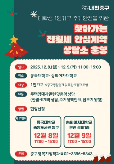 [뉴스스텝] 서울 중구가 12월 8일과 9일에 동국대학교와 숭의여자대학교에서 대학생 1인 가구의 전월세 계약에 대한 불안과 부담을 덜어줄‘찾아가는 전월세 안심계약 상담소’를 운영한다. 지난 6월에 이은 두 번째 방문이다.
