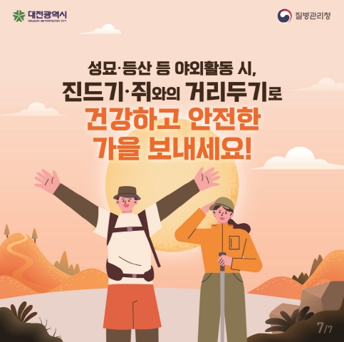 [뉴스스텝] 대전시는 성묘와 등산, 농작업 등 야외활동이 늘어나는 가을철을 맞아 시민들에게 진드기·설치류 매개 감염병 예방수칙 준수를 당부했다.