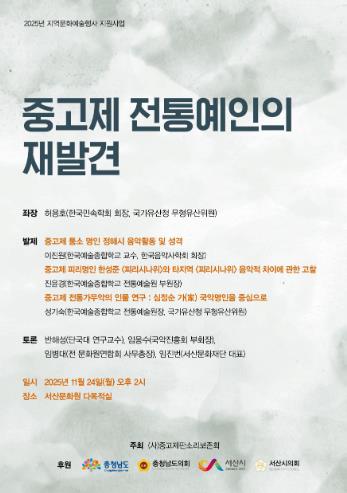(사)중고제판소리보존회 주최로 서산문화원 다목적실에서 열리는 이번 학술세미나는 한국예술종합학교 전통예술원 교수들의 논문 발제와 국악계 전문연구자 및 지역의 문화계 인사들이 토론자로 참여하여 관심을 모은다.