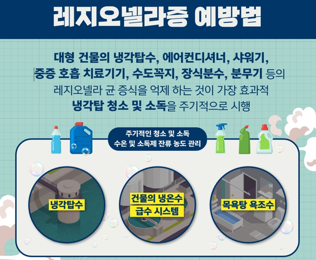 레지오넬라증은 제3급 법정 감염병으로, 대형 건물의 냉각탑수, 급수시설, 대중목욕탕 욕조수 등 오염된 물에 존재하던 균이 비말형태로 호흡기를 통해 인체에 감염된다. 주요 증상은 발열, 기침, 근육통 등 독감과 유사한 증상을 보이다가 일주일 내 호전되지만, 면역저하자나 기저질환이 있는 고위험자의 경우 폐렴으로 악화될 수 있어 각별한 주의가 필요하다.