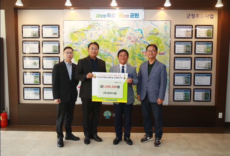 ▲ ㈜건우기업, 곡성군 교육사업 지원하기 위해 곡성군미래교육재단에 5백만 원 기탁 |