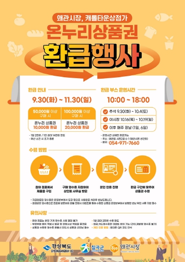 [뉴스스텝] 칠곡군은 전통시장 활성화와 지역경제 활력 제고를 위해 9월 30일(화)부터 11월 30일(일)까지 전통시장 구매 고객을 대상으로 온누리상품권 환급행사를 진행한다.