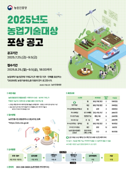 [뉴스스텝] 농촌진흥청은 농업과학기술 발전에 크게 기여한 개인 또는 기관・단체를 포상하는 ‘2025년도 농업기술대상’ 후보자 추천을 공모한다.