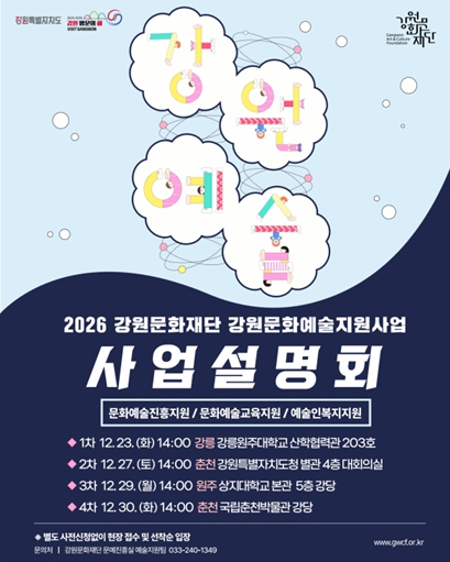 한편, 지난 23일 강릉원주대학교 산학협력관에서 개최된 사업설명회는 강릉·동해·삼척·속초·양양·고성 등 영동지역을 대상으로 진행됐으며, 150여명의 예술인이 참석해 2026년 강원문화예술지원사업에 대한 높은 관심 속에 성황리에 마무리됐다.