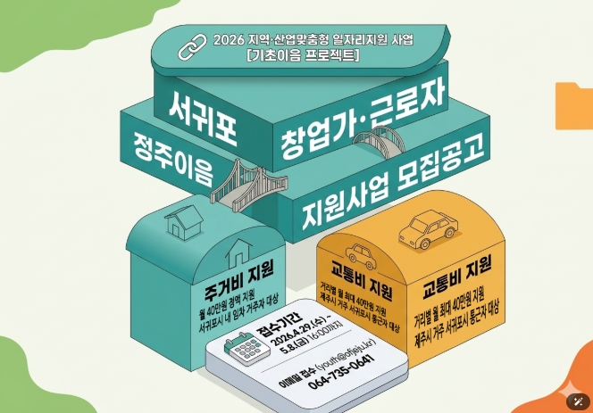 [뉴스스텝] 제주특별자치도와 제주콘텐츠진흥원(원장 강민부)은 고용노동부와 함께 서귀포시 창업 생태계 활성화와 우수 인력의 안정적인 지역 정착을 위해 '2026 서귀포 창업가·근로자 정주이음 지원사업' 참여자를 모집한다.