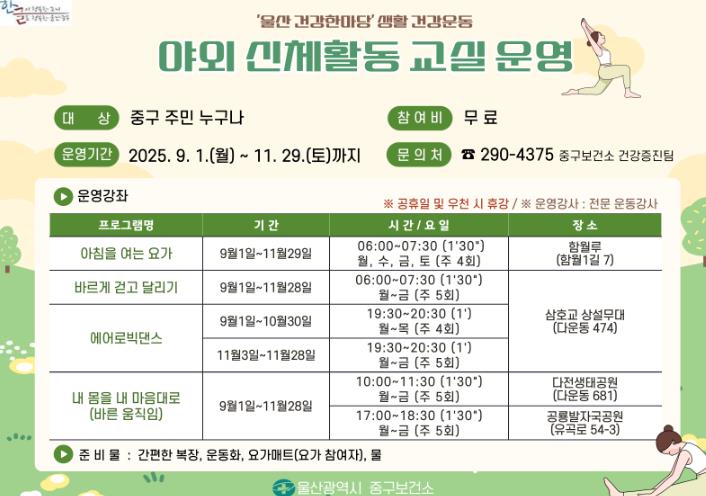 [뉴스스텝] 울산 중구보건소가 오는 9월 1일부터 11월 29일까지 지역 내 공원과 광장 등에서 주민들을 위한 야외 신체활동 프로그램을 운영한다.