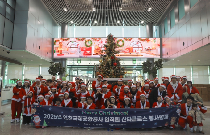 ▲ 25일 진행된 ‘2025 인천공항 임직원가족 산타클로스 봉사활동’에서 인천국제공항공사 임직원가족 산타클로스 봉사단이 기념촬영을 하고 있다.
