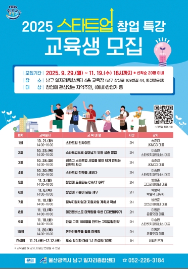 교육은 매주 2회 화, 목요일 14:00부터 16:00까지 울산 남구 일자리종합센터 4층 교육장에서 진행되며, 신청은 방문과 QR코드, 전화로 가능하다.