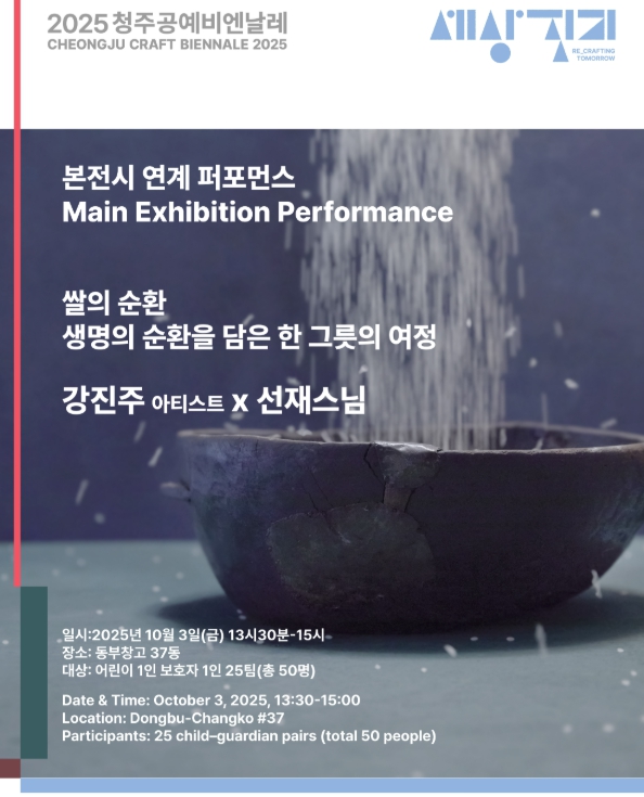 2025 청주공예비엔날레 본전시와 연계한 이번 프로젝트는 쌀을 매개로 생명의 순환과 공동체에 대한 천착을 담아온 작가 강진주와 사찰 음식이 곧 수행이었던 선재 스님이 만나 ‘쌀의 순환 – 생명의 순환을 담은 한 그릇의 여정’을 풀어내는 퍼포먼스다.