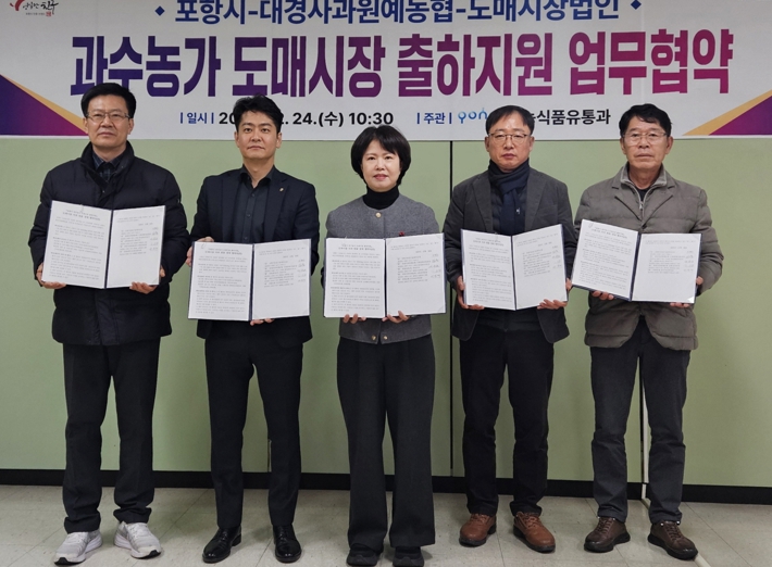 [뉴스스텝] 포항시는 24일 포항시 농산물 도매시장에서 2026년 신규사업인 ‘과수농가 도매시장 출하지원사업’의 원활한 추진을 위한 업무협약(MOU)을 체결했다.