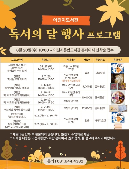 이천시 어린이도서관의 9월 독서의 달 행사와 관련된 자세한 내용은 이천시통합도서관 누리집에서 확인할 수 있다.