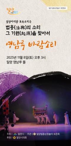 [뉴스스텝] 경남 밀양시는 오는 8일 오후 3시 영남루 마당에서 밀양법흥상원놀이 토속소리극 ‘영남루 바람소리’ 공연을 선보인다고 5일 밝혔다.