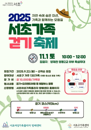 [뉴스스텝] 서울 서초구는 서초여성가족플라자 방배센터, 서초구 가족센터와 함께 11월 1일 서울의 대표적인 생태하천인 양재천에서 ‘2025 서초가족 걷기 축제’를 개최한다고 밝혔다.