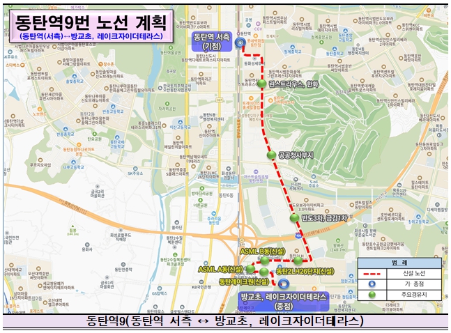 먼저, 동탄역9번 노선은 동탄역(서측)을 기점으로 반도체 글로벌 기업인 ASML을 거쳐 방교초등학교까지 운행하는 노선으로 정류장 8개소를 신설하여 출퇴근 수요 대응과 대중교통 서비스 취약지역인 방교동 일부 지역의 교통불편을 해소할 것으로 기대한다. 동탄역10번 노선은 동탄역(동측)을 기점으로, 동탄테크노밸리, 동탄첨단산업단지를 직접 연결하고 대중교통 이용편의 및 접근성 향상을 위해 정류장 2개소를 신설하여 운행할 예정이다.