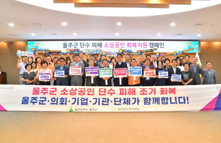 ▲ 울산 울주군이 29일 군청 문수홀에서 이순걸 군수와 울주군의회 최길영 의장 및 군의원, 소상공인연합회, 외식업지부, 관내 기업 관계자 및 지역 사회단체장 등 40여명이 참석한 가운데 ‘단수 피해 소상공인 회복지원 캠페인’을 개최했다. |