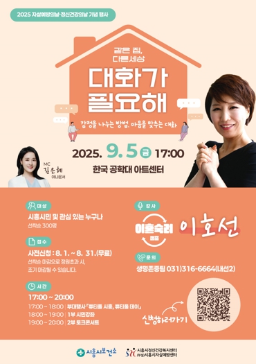 이번 행사는 ‘같은 집, 다른 세상-대화가 필요해: 감정을 나누는 방법, 마음을 맞추는 대화’를 주제로 가족 간 건강한 소통과 마음 건강의 중요성을 알리고, 자살 예방과 정신건강 증진에 대한 사회적 관심을 높이고자 마련됐다. 행사는 부대행사와 시민강좌, 토크콘서트로 구성된다.