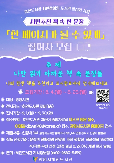 [뉴스스텝] 광명시 하안도서관은 오는 4일부터 25일까지 시민이 직접 추천한 책 속 한 문장을 전시하는 ‘한 페이지가 될 수 있게’ 참여자를 모집한다.