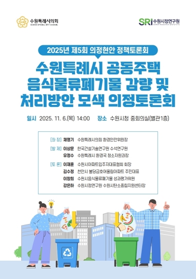 [뉴스스텝] 수원특례시의회 환경안전위원회는 11월 6일, 오후 2시, 수원시청 별관 1층 중회의실에서 ‘공동주택 음식물류폐기물 감량 및 처리방안 모색을 위한 의정토론회’를 개최한다고 밝혔다.