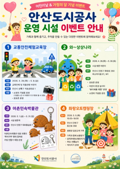 김인옥 안산도시공사 관광레저부장은 “가정의 달을 맞아 어린이와 가족이 함께 즐길 수 있는 다양한 체험 프로그램을 마련했다”며 “앞으로도 시민이 공감하고 참여할 수 있는 체험형 콘텐츠를 지속 확대해 나가겠다”고 말했다.