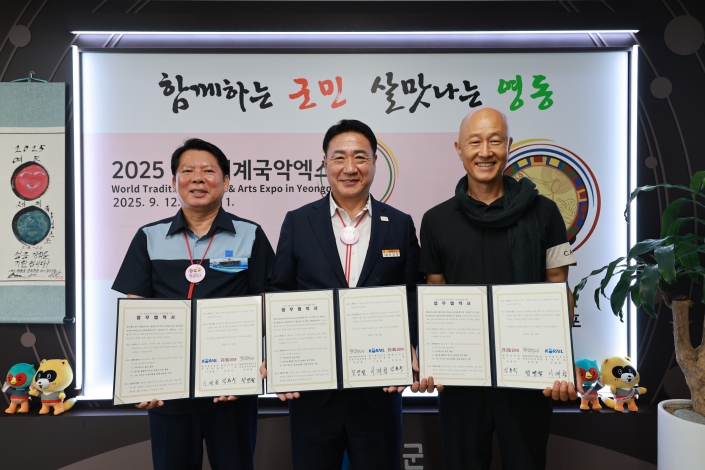 [뉴스스텝] 영동세계국악엑스포조직위원회(공동조직위원장 김영환 충북도지사, 정영철 영동군수)는 코레일 영동역(역장 이재철), 온라인 철도여행 커뮤니티 레일코리아(대표 김용옥)와 7월 29일 영동군청에서 2025영동세계국악엑스포 성공개최를 위한 업무협약을 체결했다.