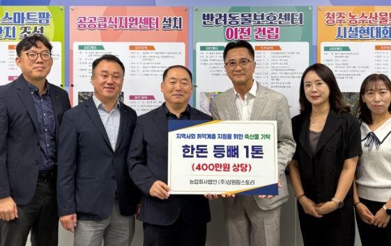[뉴스스텝] 청주시 청원구 북이면에 위치한 ㈜삼원팜스토리(대표 서중원)는 10일 청주시청을 방문해 지역 소외계층에게 전달해달라며 한돈 등뼈 1톤(400만원 상당)을 기탁했다.