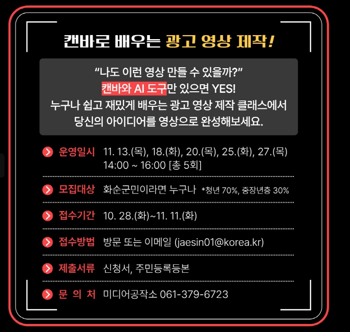 [뉴스스텝] 화순군은 오는 11월13일 오후 2시 화순군 청년센터(청춘들락) 미디어공작소에서 화순군민을 대상으로 AI와 캔바로 배우는 광고영상 제작하기 교육을 진행한다고 밝혔다.