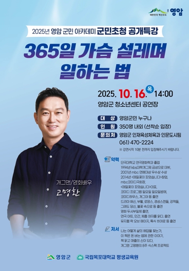 [뉴스스텝] 영암군이 10월16일 오후 2시 청소년센터에 개그맨이자 방송인인 고명환 씨를 초청해 군민아카데미 제5회 공개특강을 개최한다.