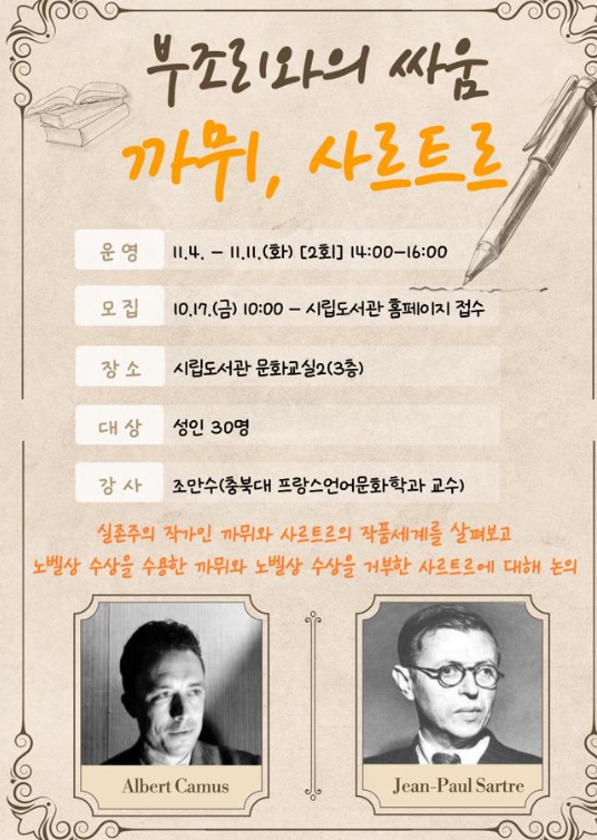 강연은 조만수 충북대학교 프랑스언어문화학과 교수가 맡아, 20세기 문학과 철학의 거장인 알베르 까뮈와 장 폴 사르트르의 작품세계를 탐구한다.