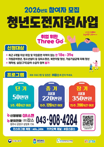 [뉴스스텝] 충북경제자유구역청은 구직 의욕이 낮아진 도내 청년들의 원활한 사회 진출을 돕기 위해 고용노동부가 주관하는 ‘2026년 청년도전 지원사업’의 국비 11억 6,000만 원을 확보하고 본격적인 참여자 모집에 나선다고 밝혔다.