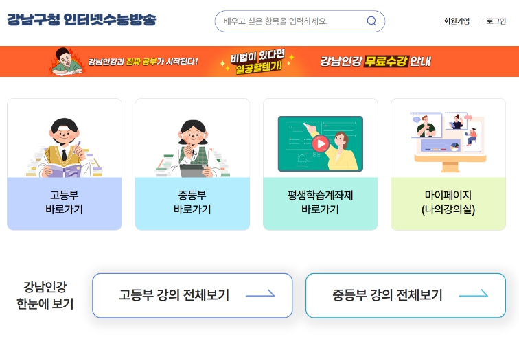 ‘강남인강’에서는 중등부 내신 강의부터 고등부 수능 준비까지 단계별, 수준별 인터넷 강의를 지원하고 있으며, 대치동 강사, 중‧고등 현직 교사와 EBS 수능 스타강사 등 실력파 강사들이 직접 강의를 진행한다.