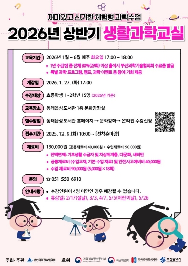 [뉴스스텝] 부산 동래구는 2026년 1월부터 동래읍성도서관과 안락누리도서관, 온빛어린이 작은도서관에서 부산과학기술협의회와 연계해 관내 초등학생을 대상으로 ‘생활과학교실'을 운영한다고 밝혔다.