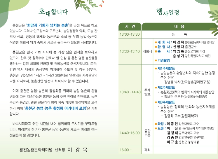 이후 종합토론에서는 강원대학교 이종인 교수가 좌장으로 참여하며, 한국농어촌공사 이진 지역개발지원단장, 공주대학교 김정태 교수, 강원연구원 강종원 연구위원, 홍천군청 농정과 이규춘 과장이 함께 심도 있는 논의를 이어갈 예정이다.
