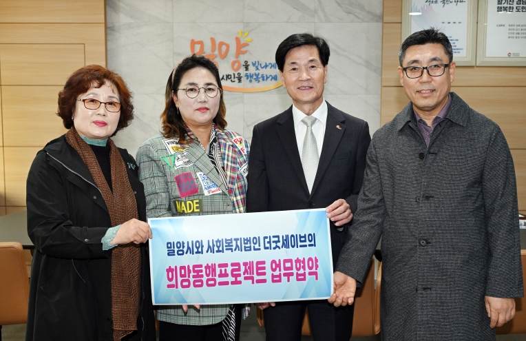 [뉴스스텝] 경남 밀양시는 5일 시장실에서 사회복지법인 더 굿 세이브(회장 박영태)와 드림스타트 아동 30여 명을 대상으로 1년간 도시락 및 맞춤형 서비스 지원을 위한 ‘희망동행 프로젝트’ 업무협약을 체결했다고 밝혔다.