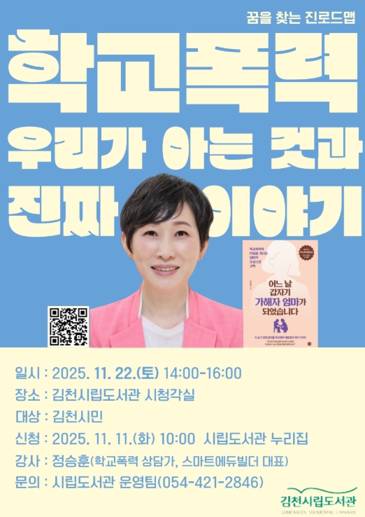 [뉴스스텝] 김천시립도서관에서는 오는 11월 22일 오후 2시, 시립도서관 본관 시청각실에서 김천시민을 대상으로 ‘학교폭력, 우리가 아는 것과 진짜 이야기’를 주제로 강연을 개최한다고 밝혔다.
