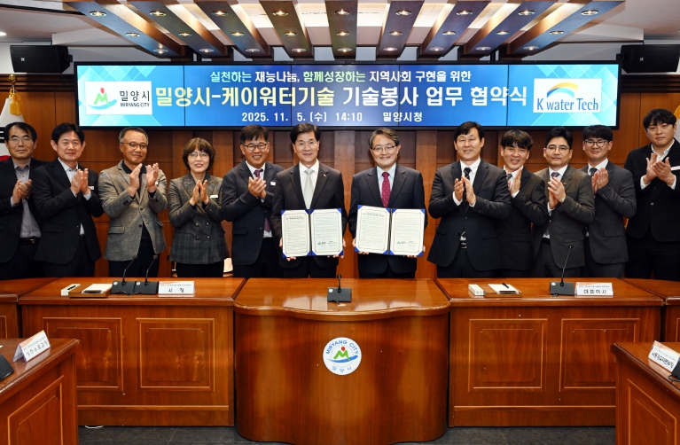 [뉴스스텝] 경남 밀양시와 케이워터기술(주)(대표 정승용)은 5일 시청 소회의실에서 ‘실천하는 재능나눔, 함께 성장하는 지역사회 구현을 위한 기술봉사 업무협약’을 체결했다고 밝혔다.