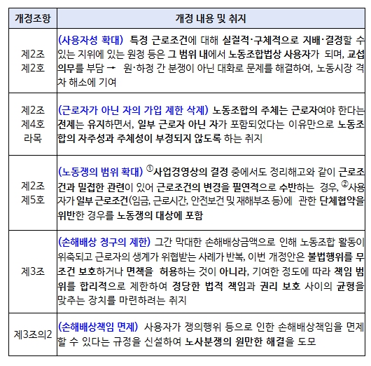| ▲ 노동조합법 개정 취지 및 주요 조항의 내용 |